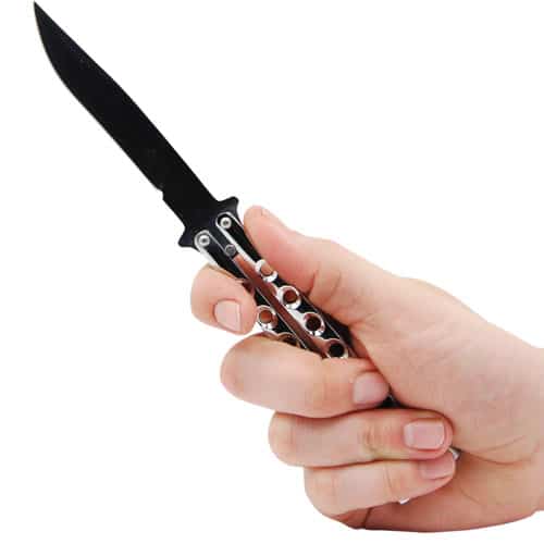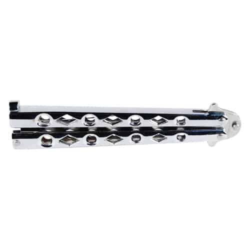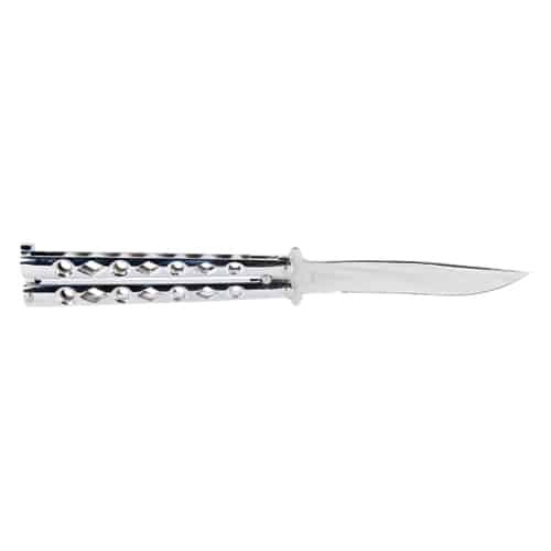 Stainless steel butterfly knife straight back blade is tapered and angled upward for a superior cut. The stainless steel handle is finished with a smooth, comfortable surface. The handle is well balanced with tactical cutouts and a light weight design for, solid flipping. The handle features a latch for to lock the knife when not in use. Chrome color