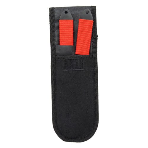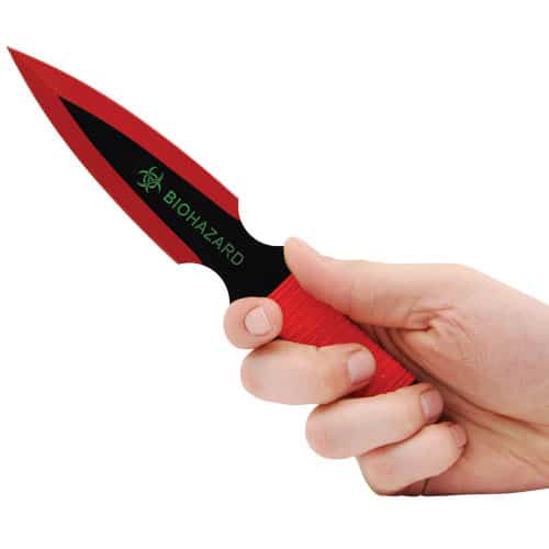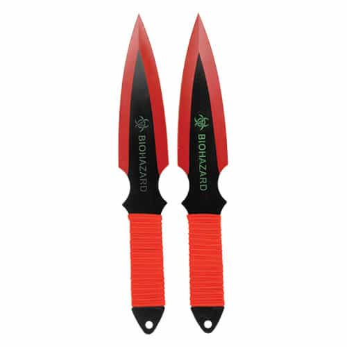 2 Piece Throwing Knife Red Color BioHazard. 9″ Length, 2 Piece Set, made from 440 stainless steel, great beginner to intermediate throwing knife. Includes sheath pouch for knives.